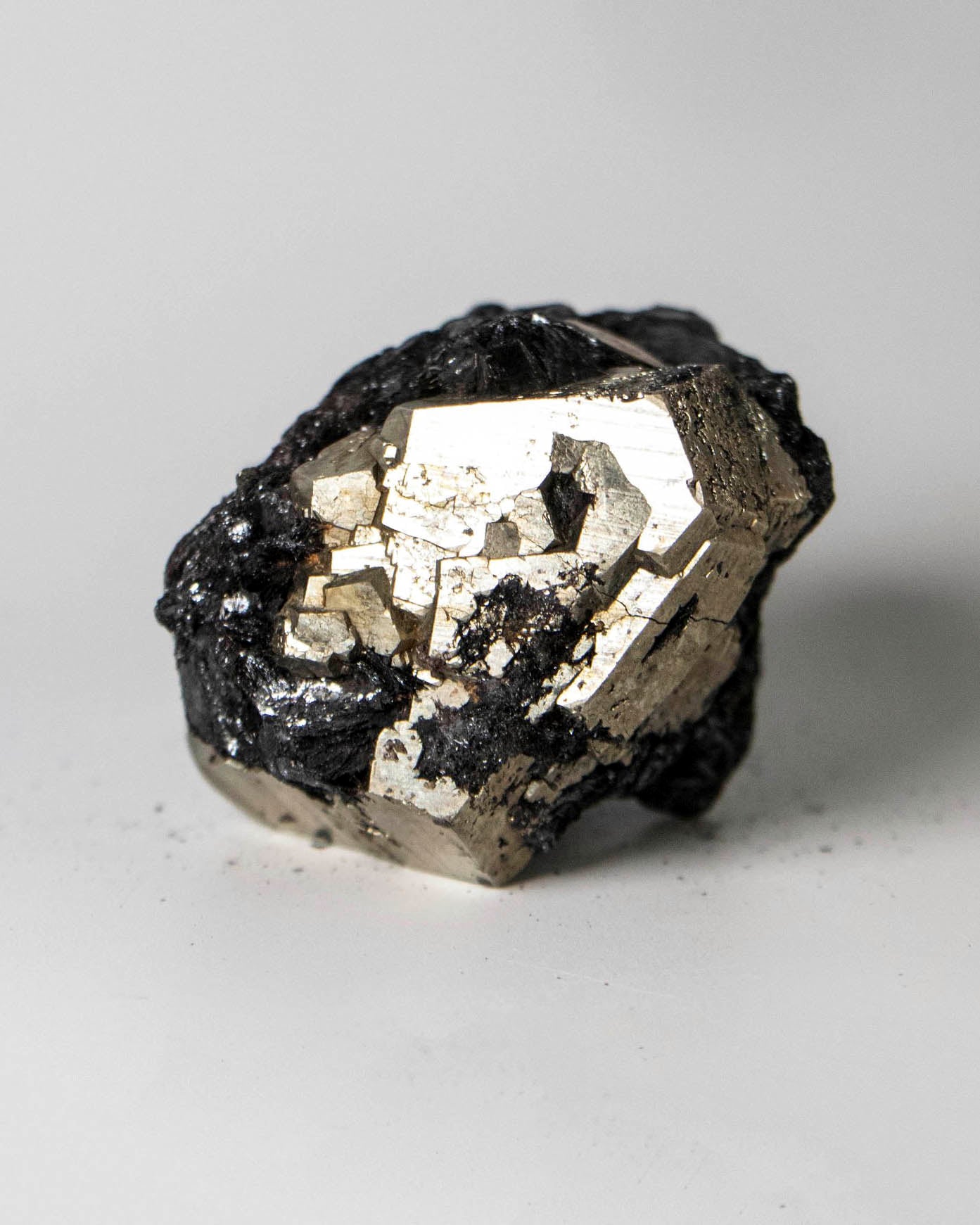 黃鐵礦以其如金幣般閃耀的金屬光澤聞名,在歷史上的淘金熱潮中,因外觀酷似黃金而被稱為「愚人金」。也因此,黃鐵礦長久以來被視為象徵財富與行動力的礦物,其溫暖而強烈的金色調,常被認為能為空間帶來積極、活躍的氣場能量。
