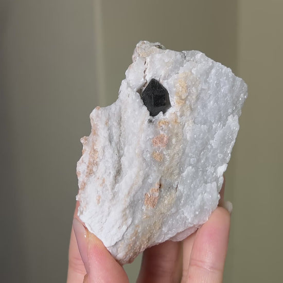 細緻的石墨包裹體,使晶體呈現柔和而深邃的黑色。水晶多呈雙尖(俗稱閃靈水晶)型態,常見一端嵌於硬石膏中,另一端清晰露出,晶體表面紋理類似溶蝕的凹凸。硬石膏天然的光澤在一般光源下閃耀動人,黑白灰的色調組合形成協調的寧靜感。